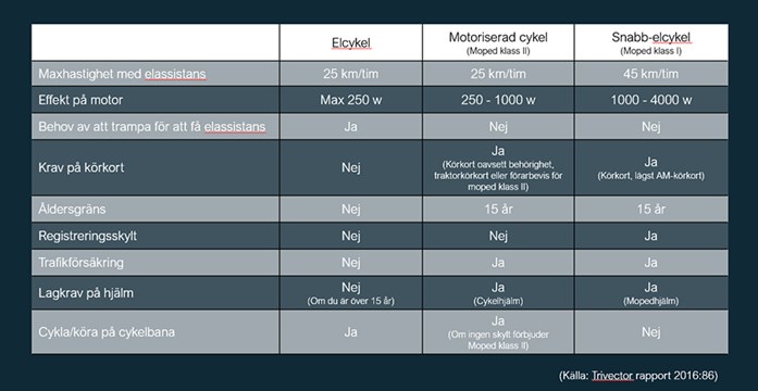För motoriserade elcyklar gäller samma regler som för moped klass II. Det betyder att föraren ska ha hjälm, vara minst 15 år och ha körkort eller förarbevis för moped klass II.