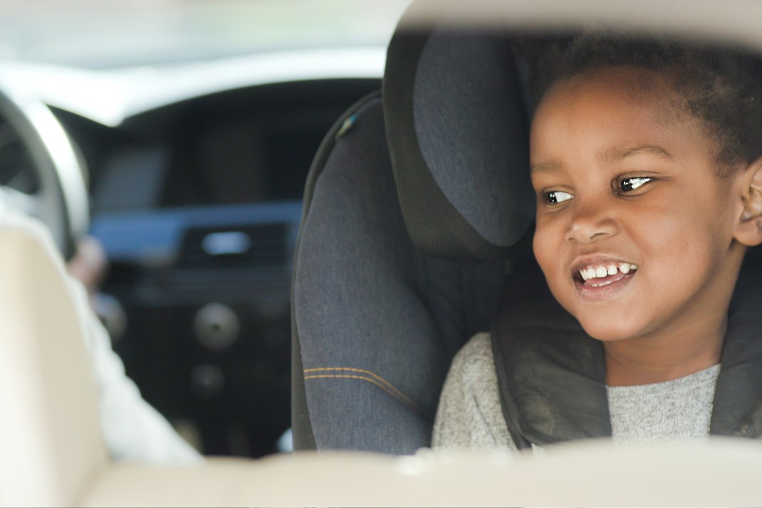I bilen har barn bälte, både i framsätet och baksätet. Små barn åker bakåtvänt.