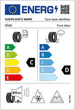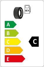 Energiklass på skalan A-E, exemplet visar energiklass C. Däck märkta med energiklass A är effektivast, vilket betyder att de har lågt rullmotstånd.