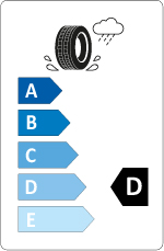 Väggrepp vid vått väglag, på skalan A - E, exemplet visar klass D. Däck märkta med klass A har bäst grepp på våta vägar.
