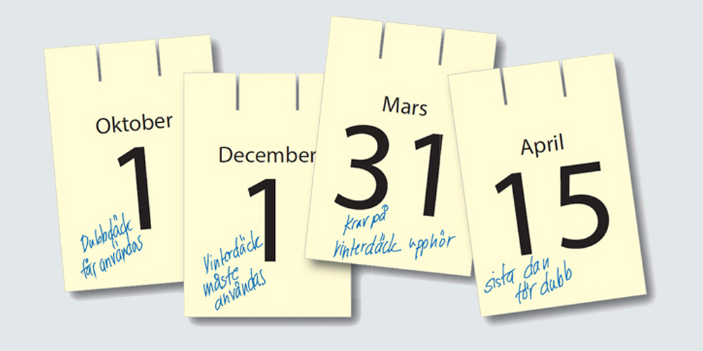Dubbdäck får användas 1 oktober – 15 april, men även under annan tid om det är eller befaras bli vinterväglag. Dubbfria vinterdäck kan sättas på tidigare på säsongen vilket gör att du i god tid innan den första halkan är väl rustad för vinterväglag.