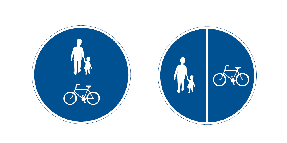Märket anger banor som är delade genom vägmarkering, skiljeremsa eller liknande i en del för gående och en del för cyklande. Symbolernas placering på märket anger vilken del av banan som är avsedd för gående respektive cyklande. Om moped klass II inte får föras på banan anges det på en tilläggstavla.