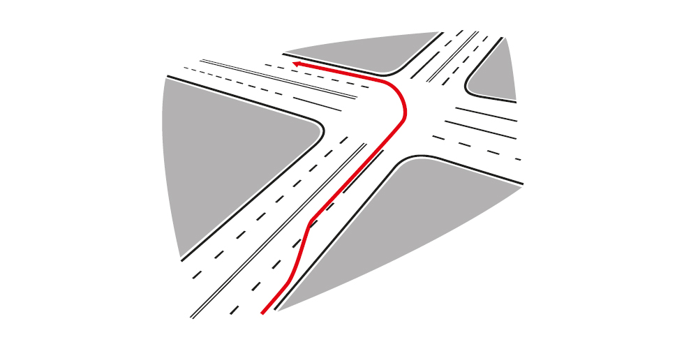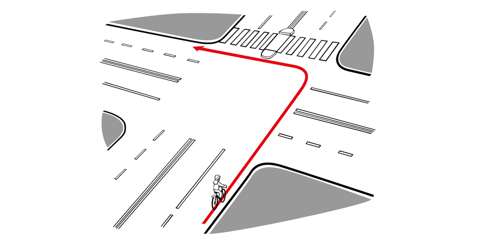 Du håller till höger på vägen och fortsätter genom korsningen till motsatta sidan. Där svänger du till vänster när vägen är fri. Är det en stor och besvärlig korsning kan det vara säkrast att leda cykeln eller mopeden. I en del korsningar kan det finnas vägmärken och markeringar som anger hur cyklister och mopedister ska köra. Det säkraste sättet att ta sig till vänster i en korsning är naturligtvis att leda cykeln eller mopeden i den. Följ då trafikreglerna för gående. Finns det ett övergångsställe så gå där och led cykeln eller mopeden bredvid övergångsstället.