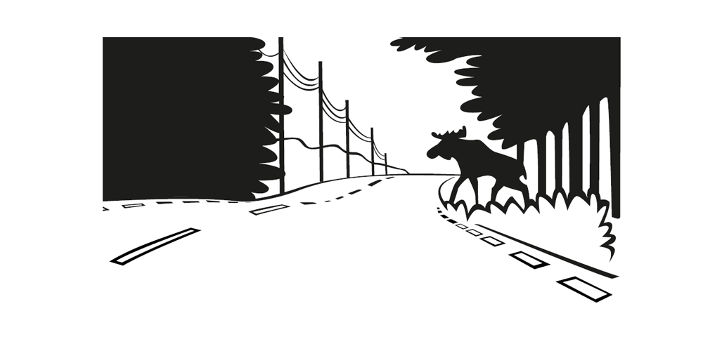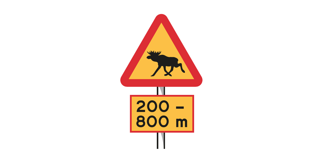 Var särskilt uppmärksam där viltstängsel slutar. Respektera varningsmärkena, som visar att djur kan finnas på vägen. Vägmärket “Varning för djur” kan även förekomma med andra symboler som hjort, ko, häst, ren, får och vildsvin.
